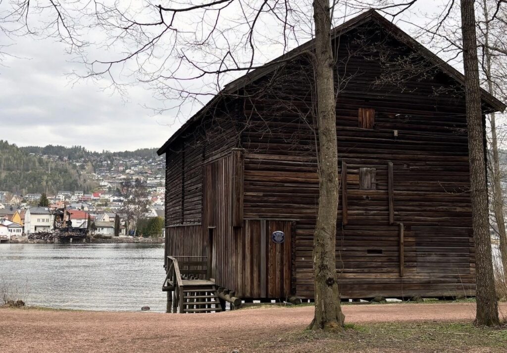 Sjøboden på Gulskogen i forgrunnen, men rett over Drammenselva ligger tvillingsjøbodens forkullede tømmerstokker.