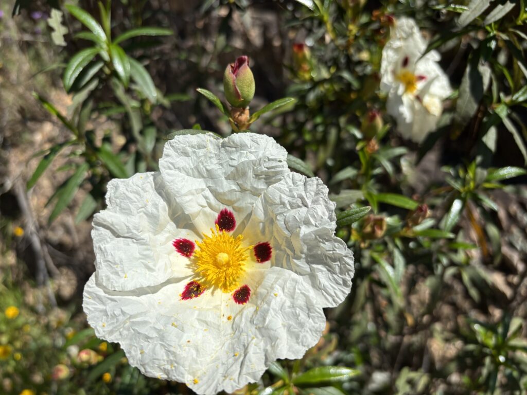 Langs stier og veier er det et utallige blomsterenger. Her ses den morsomme blomsten, rynkerose, som lever opp til navnet sitt.